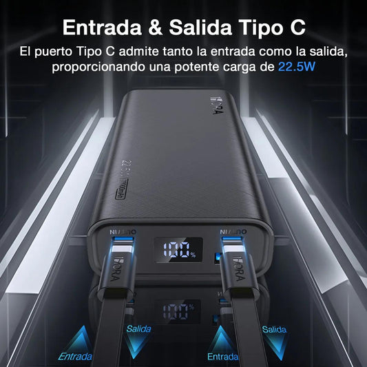 Power Bank 10000mAh, 4 Cables Incorporados, GAR148, Batería portátil con iluminación LED Linterna, Pantalla Digital Pila Portatil